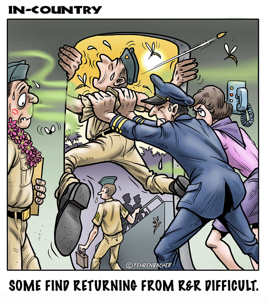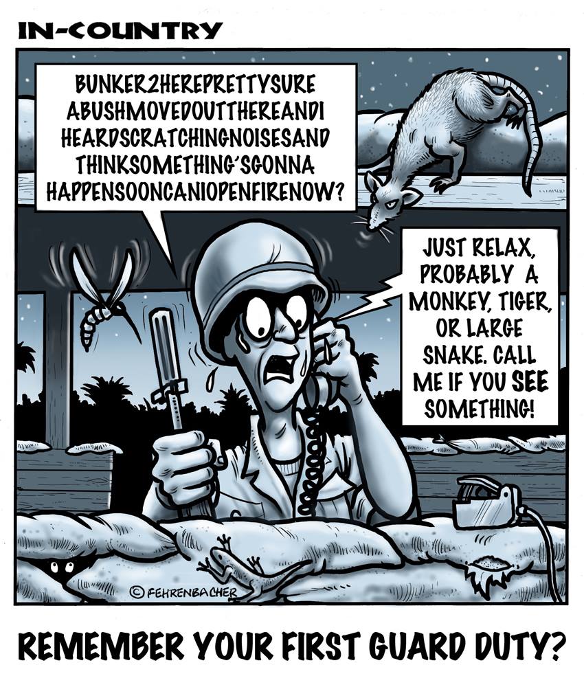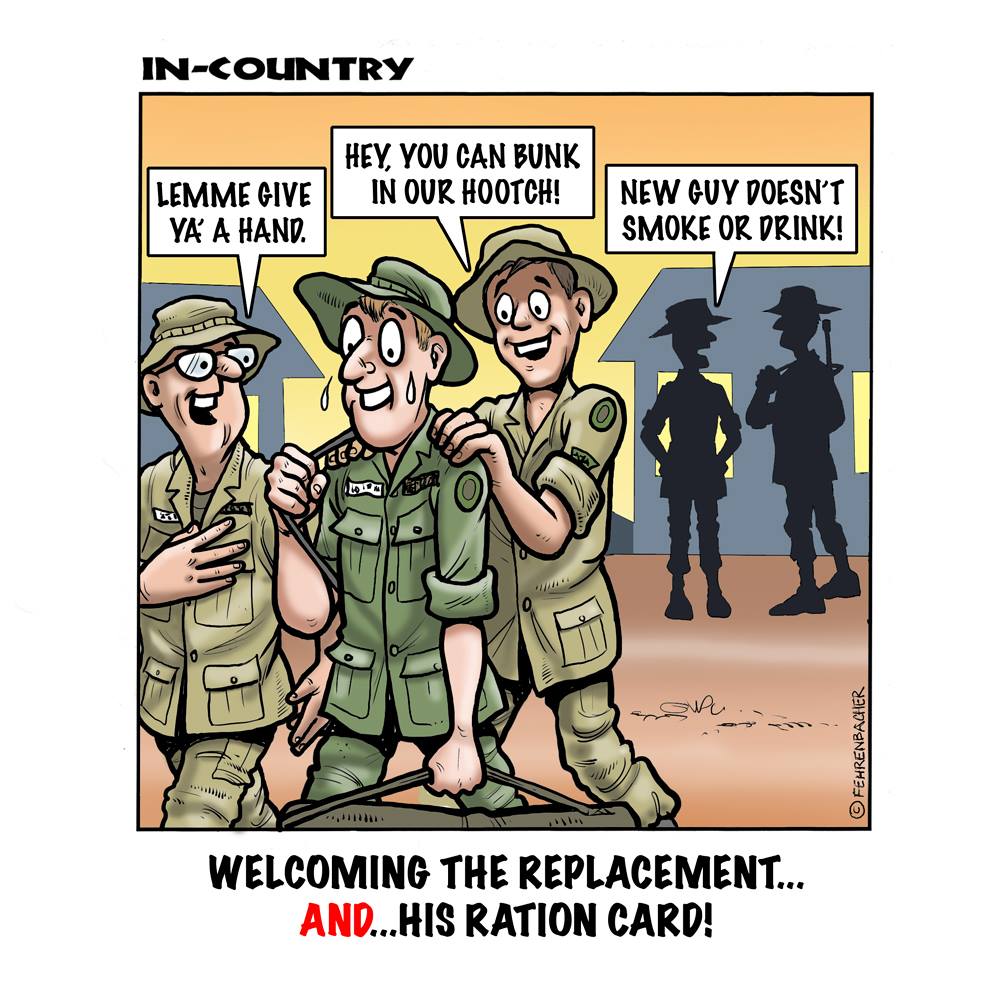 Phil enlisted in the Army in 1965 where he served for years in Vietnam. He became a graphic designer and has worked for the state of Oregon for 26 years. He retired in 2003 and started the Cartoon "In-Country". The cartoons reflect his experiences during his tour of duty in South Vietnam.