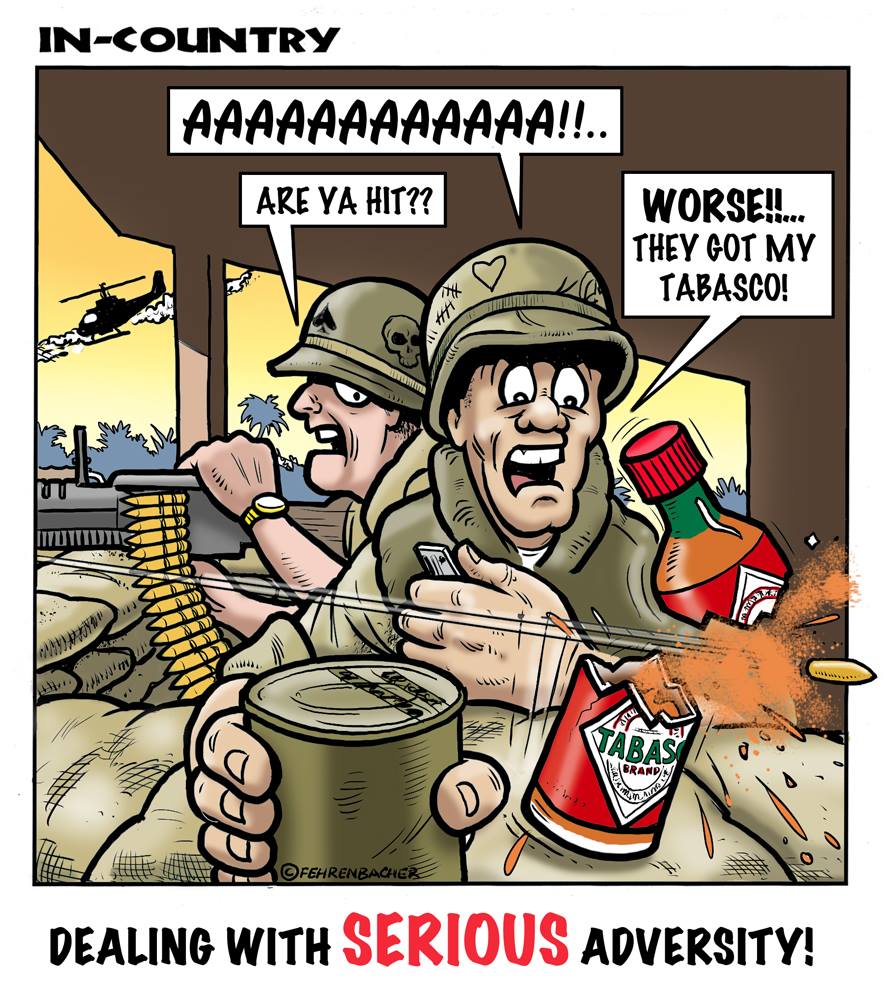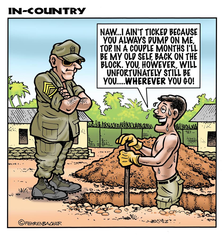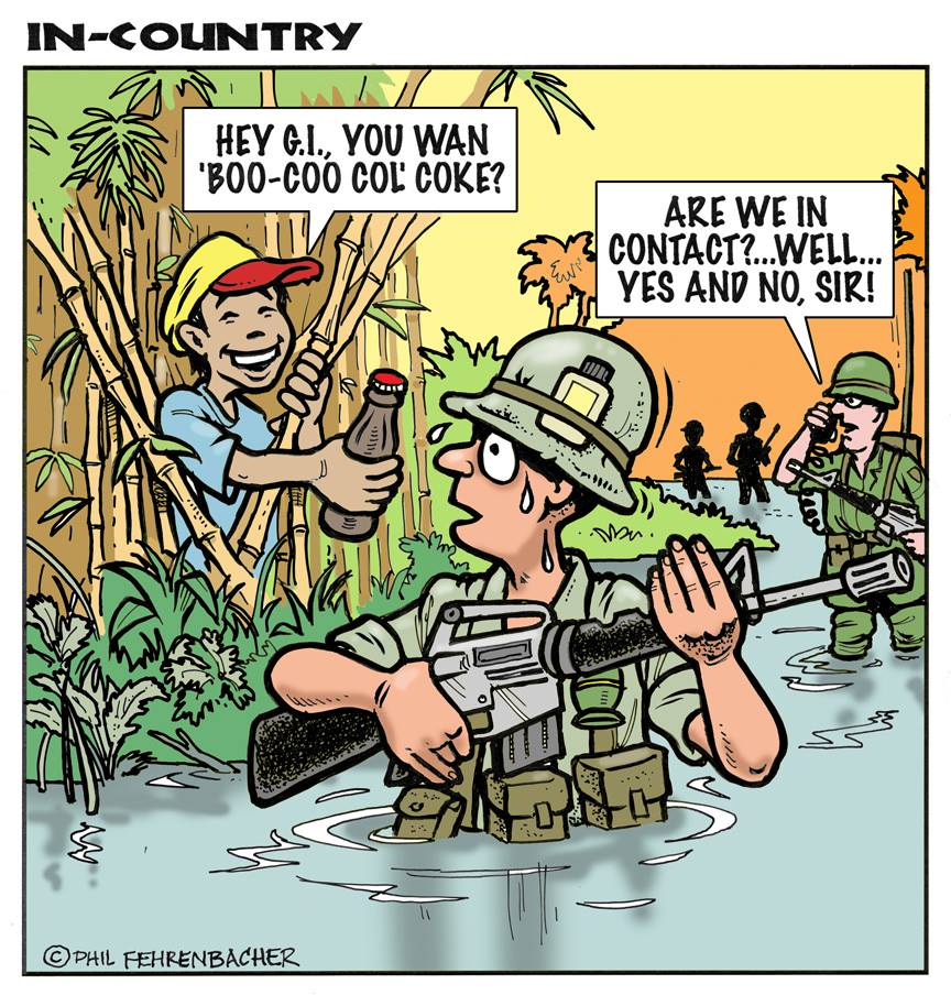 Phil enlisted in the Army in 1965 where he served for years in Vietnam. He became a graphic designer and has worked for the state of Oregon for 26 years. He retired in 2003 and started the Cartoon "In-Country". The cartoons reflect his experiences during his tour of duty in South Vietnam.